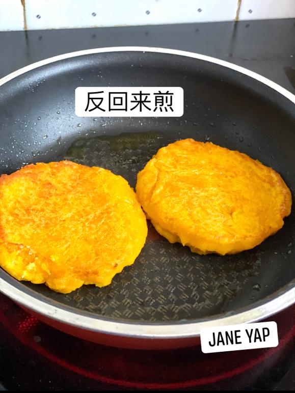 5)在热锅上加少许油,把金瓜饼状放入慢火煎熟,反面慢煎至香脆,就能上碟啦!